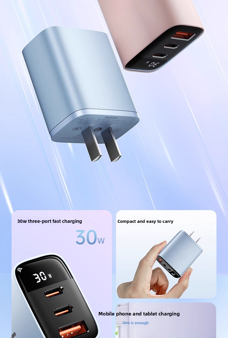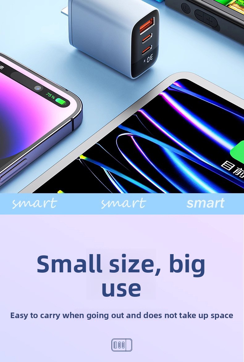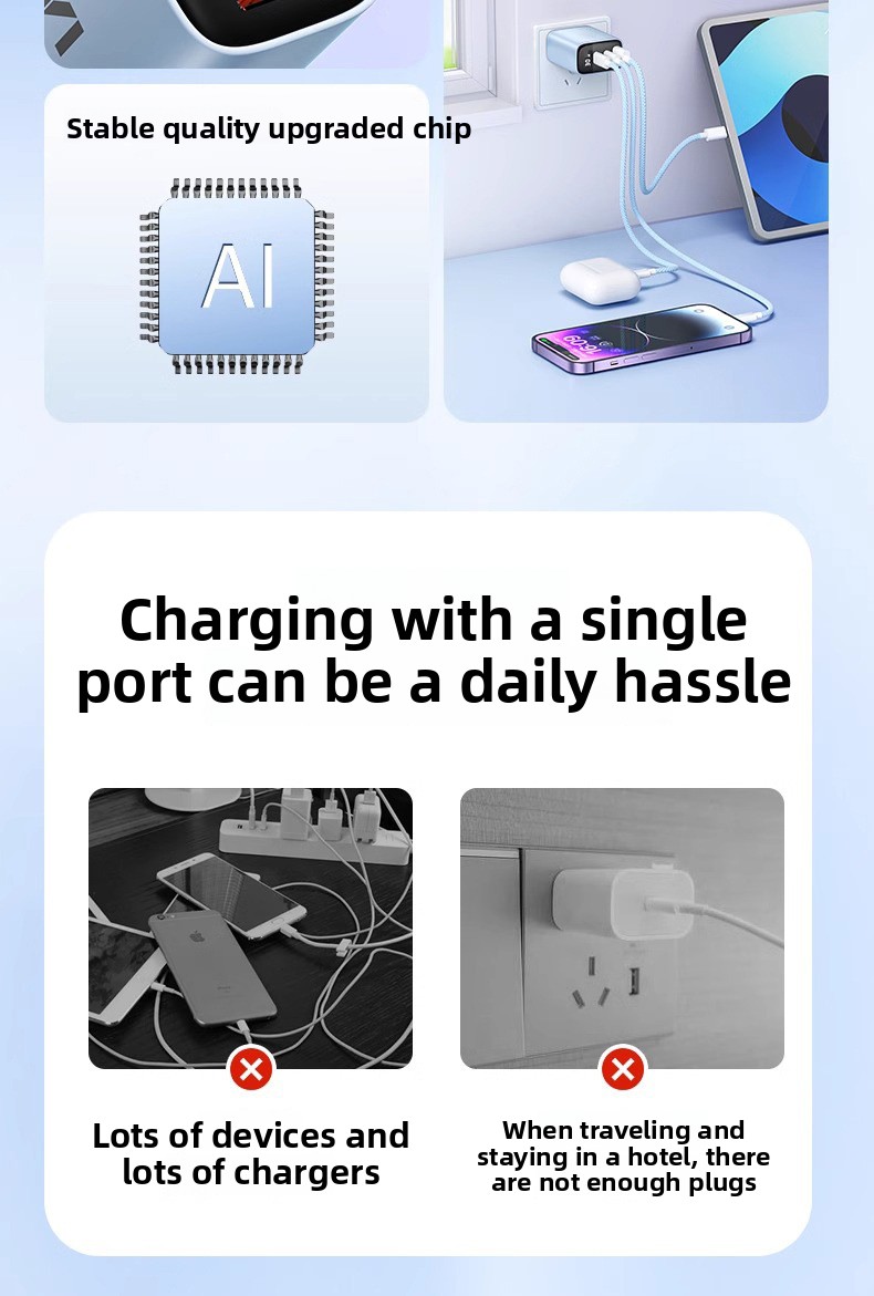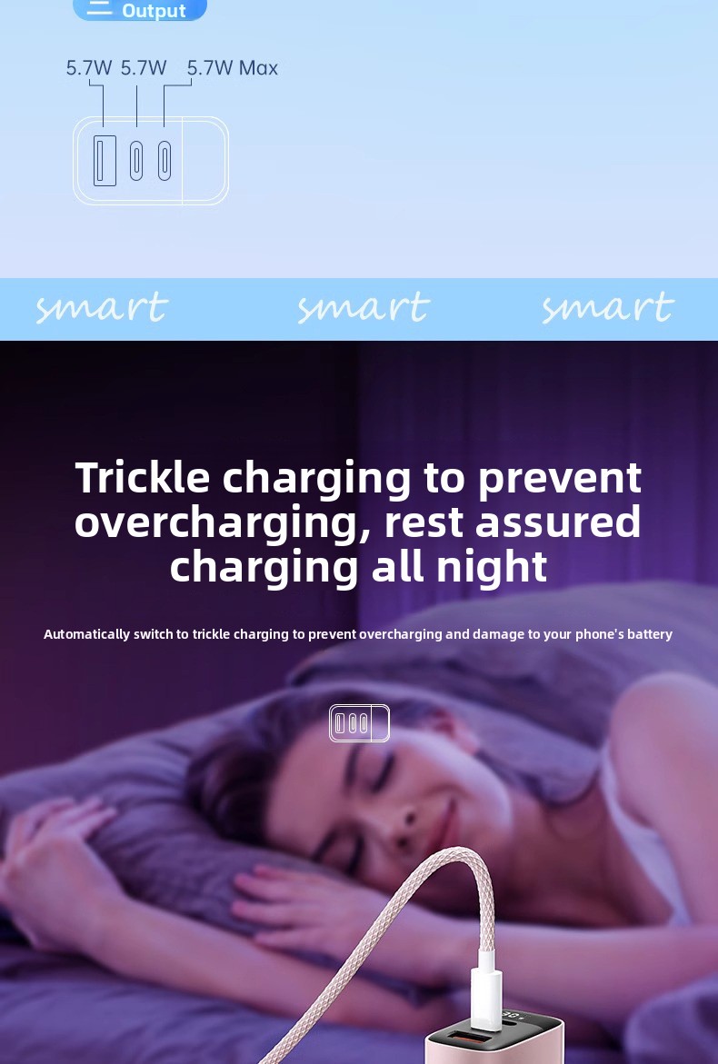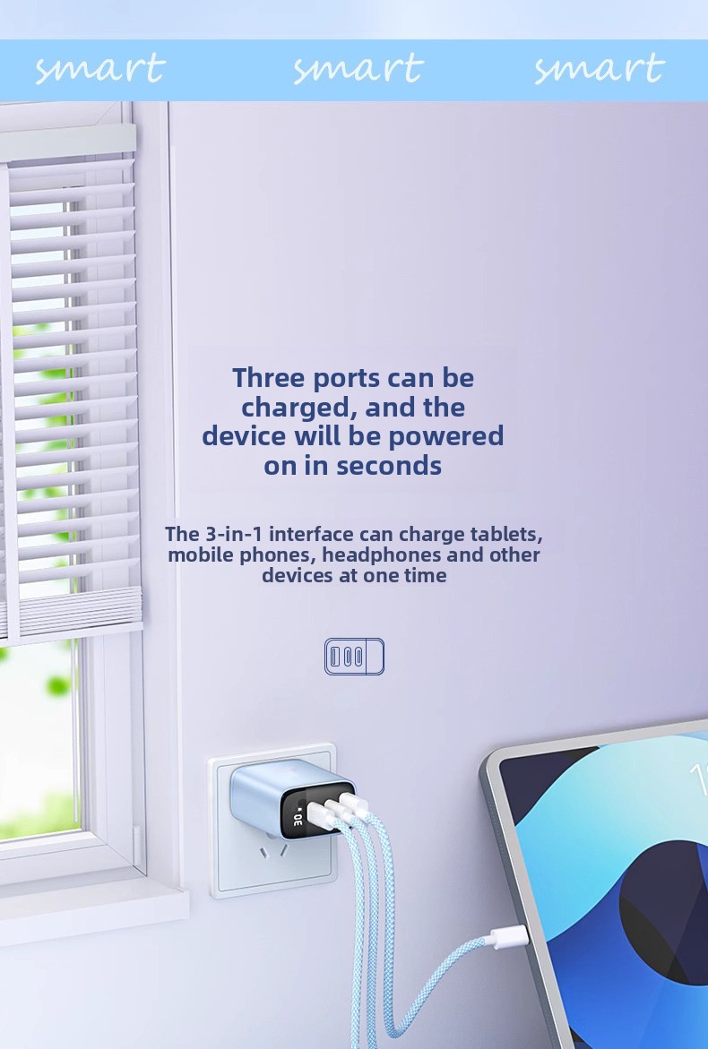 Triple Ports: Features dual Type-C and one USB port for simultaneous charging.